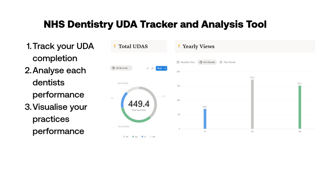 UDA Tracker helps you monitor, analyse, and visualise NHS UDA completion for your dental practice—all in one Notion template.